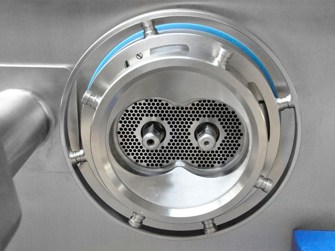 The PSS Model SFV 701 Continuous Vacuum Stuffer guarantees effective usage and ensures a continual process of metering and filling of processed materials. The processed material is fed into the PSS Model SFV 701 Continuous Vacuum Stuffer's hopper, where it is caught by two feeding worms that gently move it towards the metering device or to direct filling through the tube to the next process such as a clipping machine.